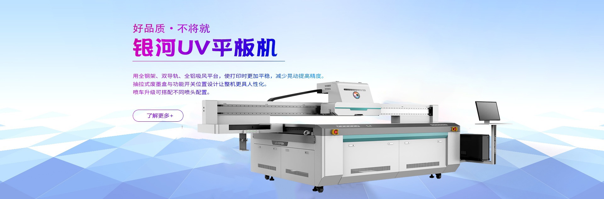 銀河BL系列UV板卷機,采用全鋼架、直線導軌、優質網帶,超寬鋁合金臺面,使打印時更加平穩,減少晃動提 高精度。噴車升級可搭配不同噴頭配置,最適合自己,便是最好。 榮耀上市,煥然一新。